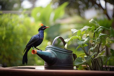 exotic bird perched on watering can, with lush greenery in the background, created with generative ai