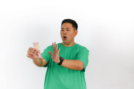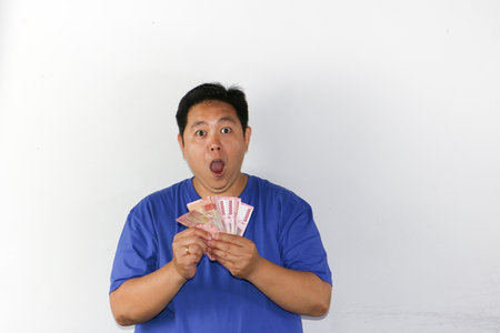 Surprised Asian man holding a lot of money on white background, indonesian rupiah