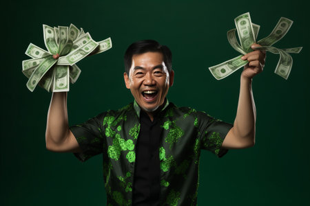 Fortunate Asian Middle Aged Man Exulting in Wealth, Reveling in Success and Lottery Victory against