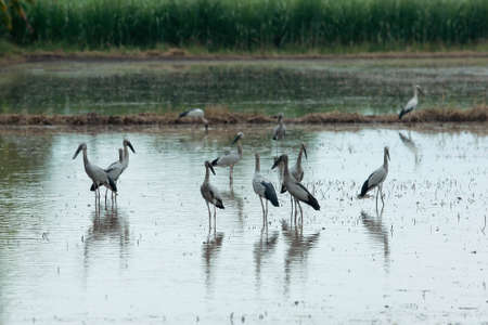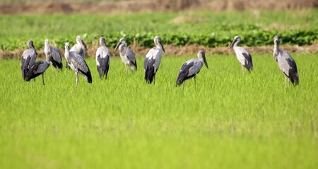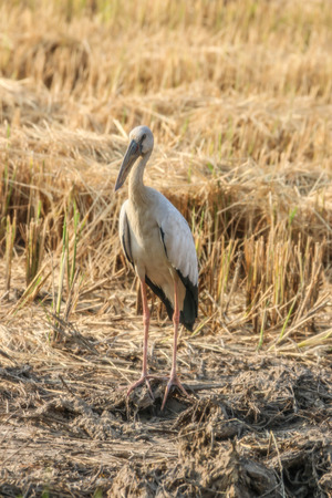 The Asian openbill (Mycteria leucocephala) in the rice field.