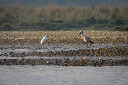 A beautiful Asian Openbill Stork or Anastomus oscitans Alongside River getting its morning breakfast.