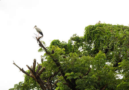 Flock of Open-billed stork, or Asian openbill birds on tree in the public park. The Asian openbill or Asian openbill stork (Anastomus oscitans) is a large wading bird in the stork family Ciconiidae.