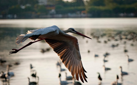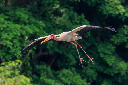 Image of an Asian openbill stork(Anastomus oscitans) flying on the natural background. Bird, Wild Animals.