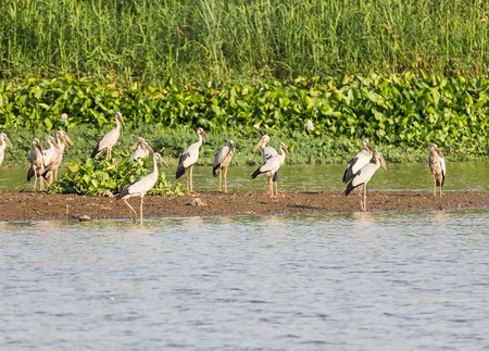 Shot of a Open bill along with other migratory birds at the Bhigwan bird sanctuary