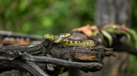 An AI illustration of An image of a vibrant green and yellow-colored snake perched on a rain-soaked tree log