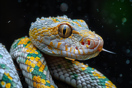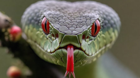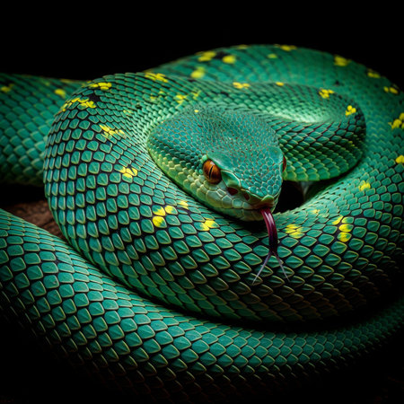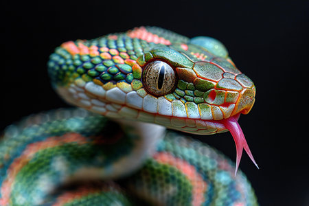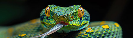 Green viper with tongue out, dark background, macro shot, intense and captivating