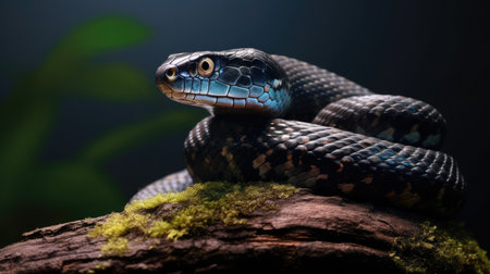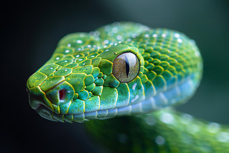 A striking, detailed close-up captures a coiled green snake in dramatic lighting. Its scales are vividly textured and its eyes hold a captivating, intense gaze, showcasing reptilian beauty.