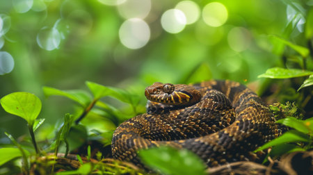A Sri Lankan Green Pit Viper, camouflaged against vibrant green foliage, coils its body, showing its intricate scales and piercing gaze.