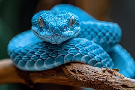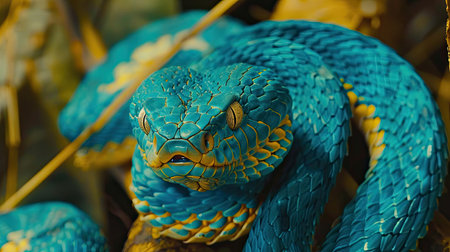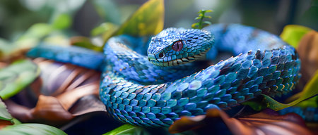 Striking Blue Viper Snake Coiled in Lush Jungle Foliage Venomous Serpent with Vibrant Scales and Dangerous Predatory Presence