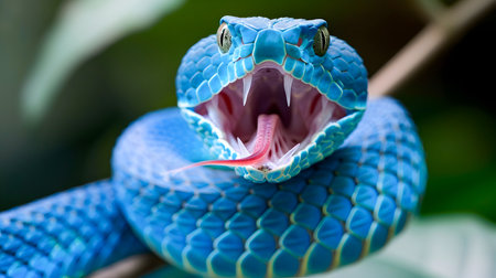 Fierce Blue Viper Snake with Gaping Mouth Displaying Fangs in Coiled Aggressive Pose in Lush Tropical Jungle Setting