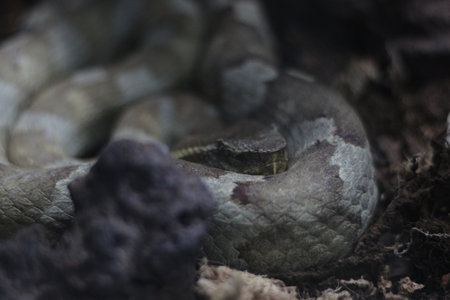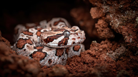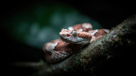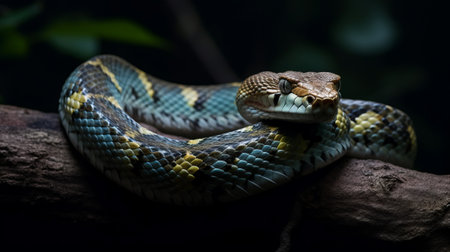 Captivating Dark Viper Gazes Intently, Showcasing Its Intricate Skin Patterns in Enigmatic Lighting