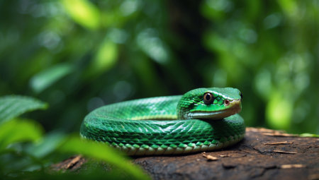 AI Generated. Close up capture of a striking emerald green snake in its vibrant natural jungle habitat