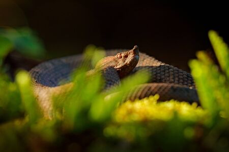 Poison snake in the nature habitat. Common Lancehead, Bothrops atrox, in the tropic forest. Poison animal in the dark jungle. Detail of rare snake from Trinidad. Coiled venomous snake with head high.