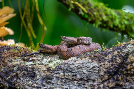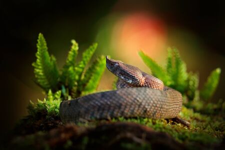 Porthidium nasutum, Rainforest Hognosed Pitviper, brown danger poison snake in the forest vegetation. Forest reptile in habitat, on the ground in leaves, Costa Rica. Widllife in Central America.