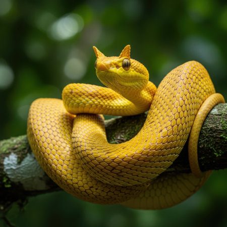 A vivid yellow snake with a distinctive pattern is coiled around a branch in a lush, green forest. The snake's head is slightly raised, and it appears to be observing its surroundings. The background is filled with dense foliage, creating a natural and serene atmosphere.