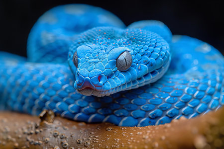 Close-up macro shot of a vivid blue viper with intense orange eyes and textured scales, showcasing the natural beauty and dangerous elegance of this venomous snake in its wild tropical habitat