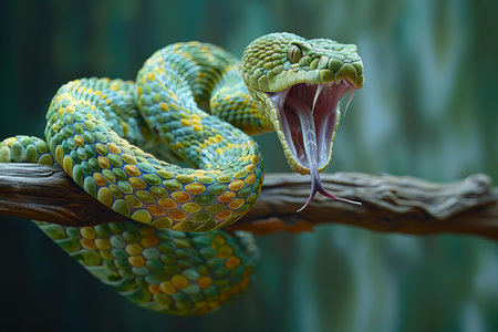A close-up of a vibrant green pit viper snake coiled on a tree branch, its mouth open revealing its fangs and forked tongue.