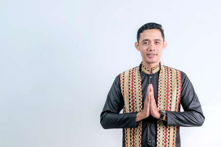 Asian muslim woman wearing prayer beads welcoming guests or Ied Fitr Greeting in white background