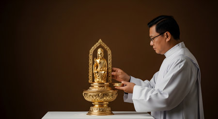 An Asian man wearing glasses and a white robe reverently performs a Buddhist ceremony. He is carefully pouring water over a beautiful golden Buddha statue that sits on an ornate pedestal. The scene, set against a simple brown background, conveys deep spirituality, faith, and tradition.