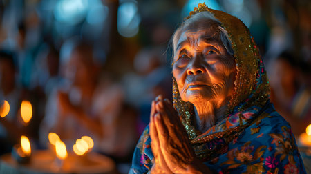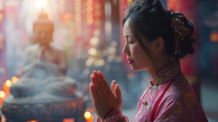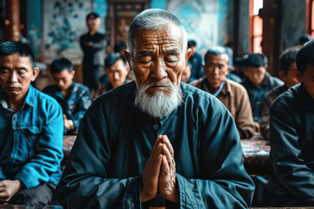 A venerable Chinese elder seeks inner peace through prayer and meditation in the serene ambiance of the temple