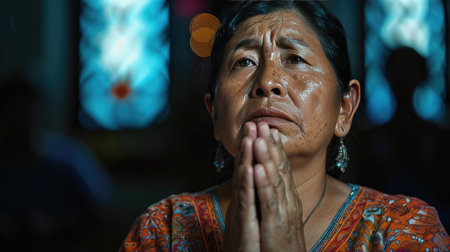 In a beautiful church interior, a woman stands in quiet reflection, hands clasped in prayer. The vibrant colors and soft light create a peaceful atmosphere for her moment of repentance.