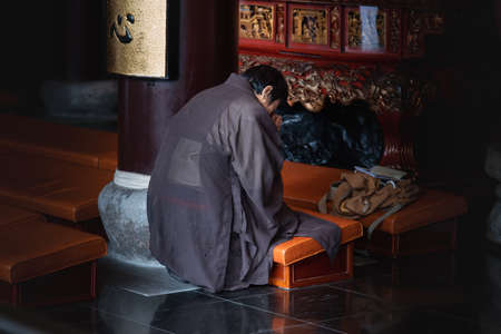 Buddhist monks praying on evening religion ceremony in temple, Hong Kong