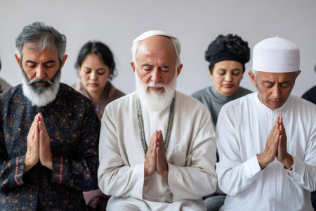 Religious leaders joining hands in prayer, embodying unity and respect while celebrating diversity across various faiths and cultures