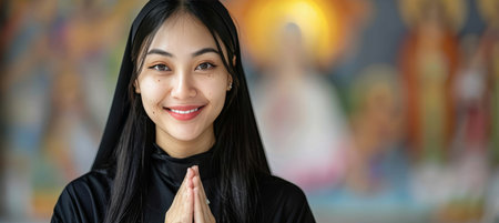 Portrait of devoted caucasian nun in black habit fervently praying in the church