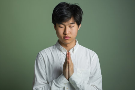 a Young Asian Man Praying: A young Asian man bowing in prayer with a humble and devout demeanor, his eyes closed and palms pressed together in a gesture of reverence. The studio background is a soothing green, evoking a sense of tranquility and harmony