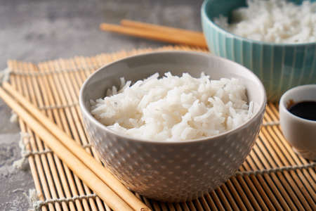 Boiled rice, chopsticks and bamboo napkin on a gray concrete background. Asian food.
