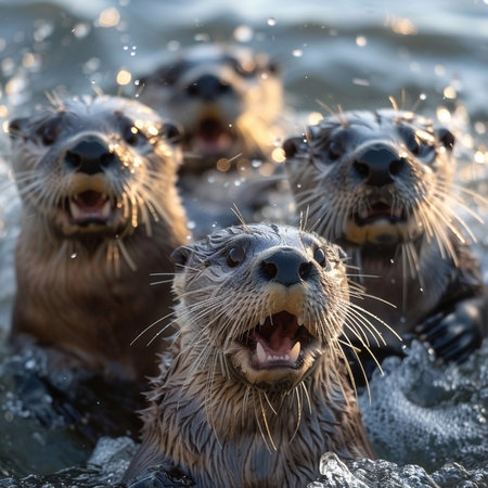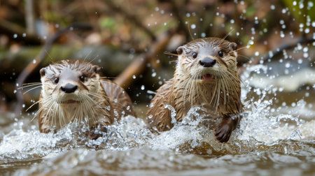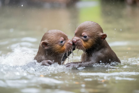Playful Otter Pups Splashing in Water: Joyful Wildlife Moment Captured.
