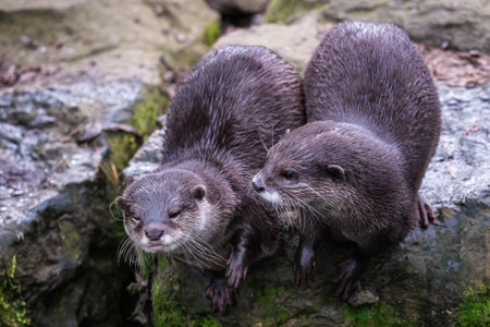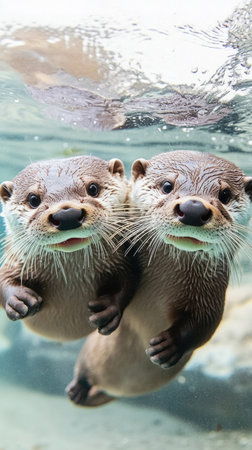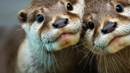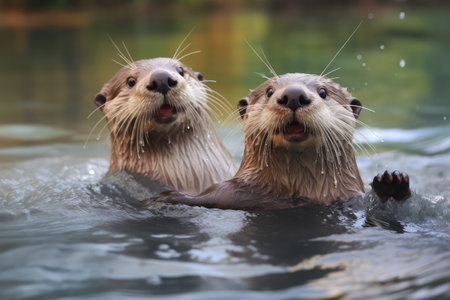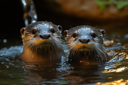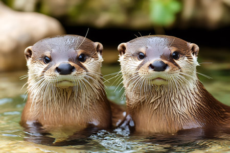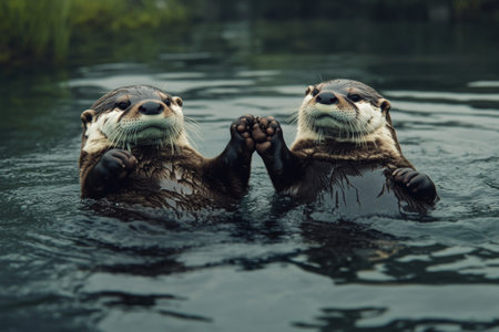 Two playful otters sharing a wistful moment in a tranquil aquatic habitat during daylight