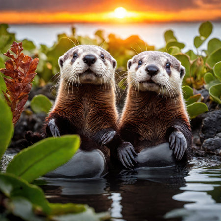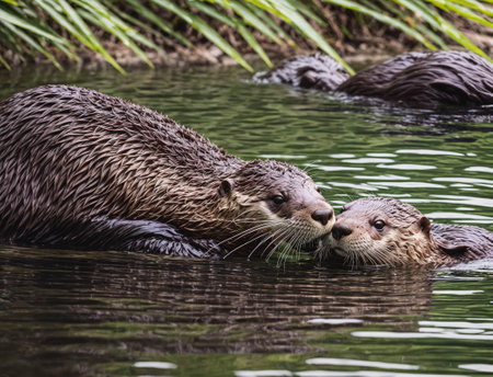 Playful river otters frolic in a lush, restored wetland, a testament to successful ecological restoration Vibrant aquatic vegetation thrives, showcasing improved water quality and biodiversity This vibrant nature scene exemplifies wildlife conservation efforts, highlighting the beauty and importance of a healthy ecosystem AI Generative
