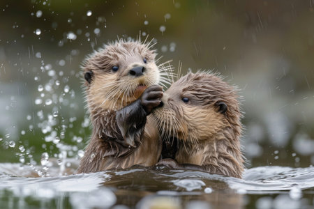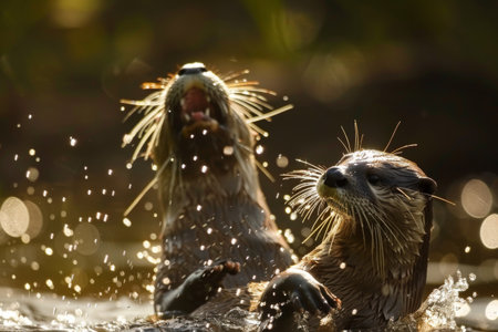 Two otters enjoy playing in the water, with one otter splashing around and creating a beautiful spray of water droplets in the sunlight. Generative AI