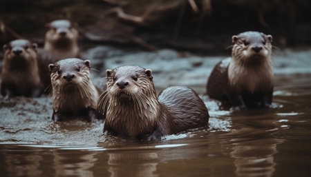 a group of otters standing in a body of water. ai generative.