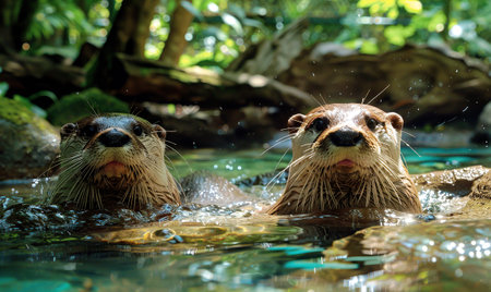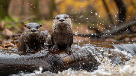 Two cute otters playing in a flowing stream surrounded by nature in a vibrant setting