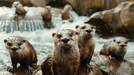 A lively scene of otters playing energetically in a bubbling stream, their fur drenched amidst the sparkling water splashes. Generative AI