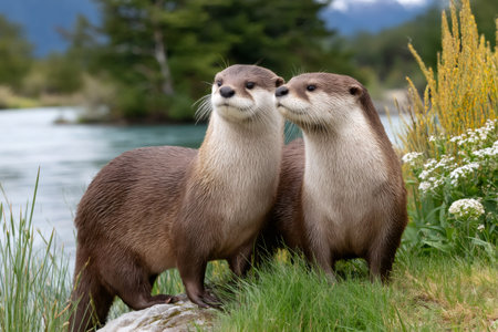 Otters looking curious on riverbank with green grass and wildflowers