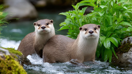 Two cute otters are standing in shallow river water near mossy rocks and green plants