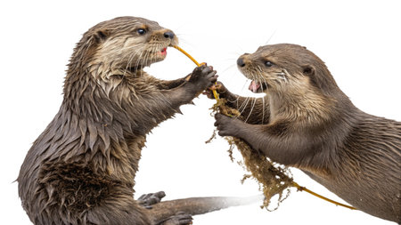 Otters fighting isolated on a white background. Studio shot.