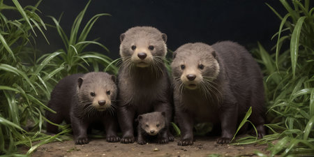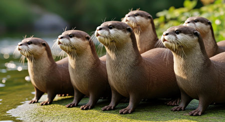 Group of curious otters raising their heads and watching with attentive expressions