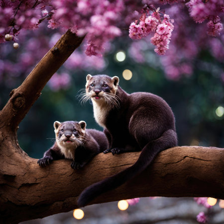 Two otters sitting on a tree branch with pink cherry blossoms in the background