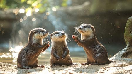Three playful otters are gathered by the water, engaging with each other in a lively scene filled with sunlight and nature.