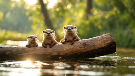 Three adorable otters sit on a log by the water, surrounded by lush greenery, basking in the warm sunlight.