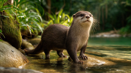 An Asian small clawed otter Aonyx cinerea standing on a rock near a stream in a lush green forest, looking playful and curious in its natural habitat.