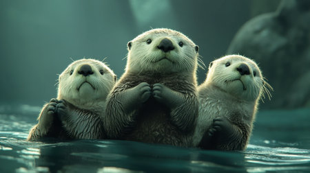 A charming trio of otters emerges from a tranquil water setting, showcasing their playful nature and adorable expressions. Perfect for wildlife themes.
