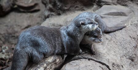 Two oriental small-clawed otters are emerging from water and staring