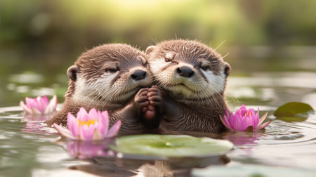 Two otters are in the water with pink flowers, AI