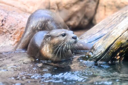 Otters swimming in the river. Close up photo.