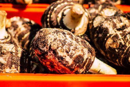 Background of pile of fresh organic taro displayed at a flea market in Asia